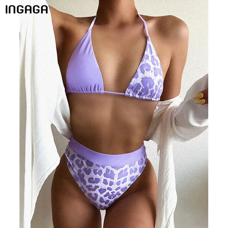Get INGAGA Leopard Swimsuits High Waist Bikinis Swimwear Women Halter Biquini High Cut Bikini Set Patchwork Bathing Suit Women only US $9.90 just for today