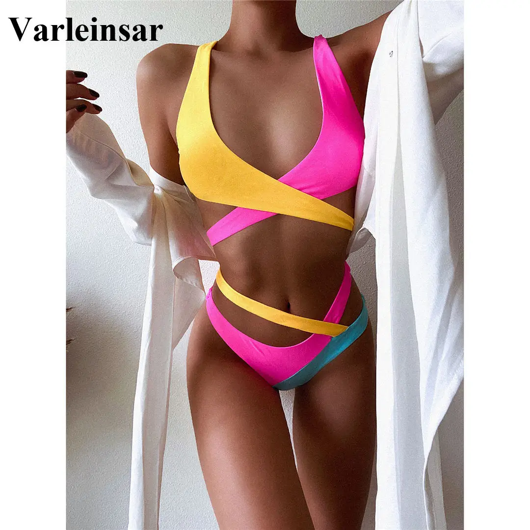 Get Colorful Splicing Bikini Female Swimsuit Women Swimwear Two-piece Bikini set Asymmetric Mid Waist Bather Bathing Suit Swim V2423 only US $9.83 just for today