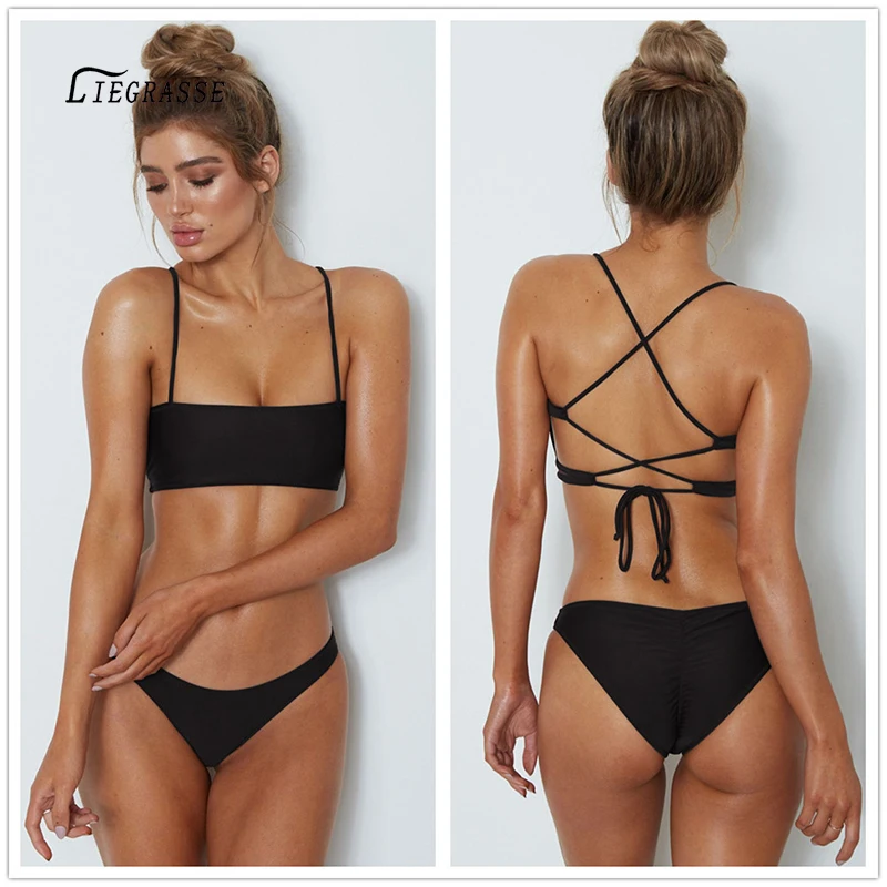 Get Liegrasse Bikini Set Solid Back Cross Swimsuit Female Swimwear Women Bathers Sports Swimwear Bathing Suit Two Piece Suit Tankini only US $11.32 just for today